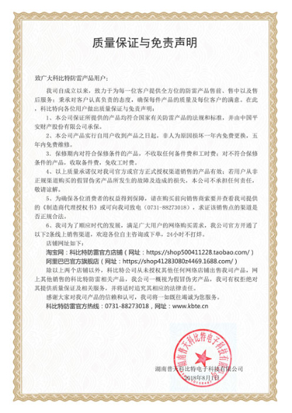 我司自成立以来,致力于为每一位客户提供全方位的防雷产品售前、售中以及售后服务;秉承对客户认真负责的态度,确保每件产品的质量及每位客户的满意。在此,科比特向各位用户做出质量保证与免责声明: